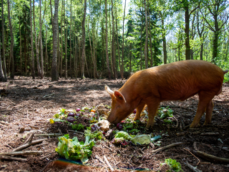 Onze varkens leven buiten in het bos, waar ze wroeten, scharrelen en een deel van hun voeding zelf vinden. Dat wroeten brengt lucht in de bodem, activeert bodemleven en helpt het bos zich te vernieuwen. Ze verwerken daarnaast reststromen zoals groenteresten en bijproducten van oliemolens, die zij omzetten in waardevol voedsel. De dieren worden minimaal een jaar oud en groeien in hun eigen tempo. Door beweging, voeding en leeftijd ontwikkelt het vlees zich anders: roder, steviger en voller van smaak, vaak dichter bij wildvlees dan bij gangbaar varkensvlees.
