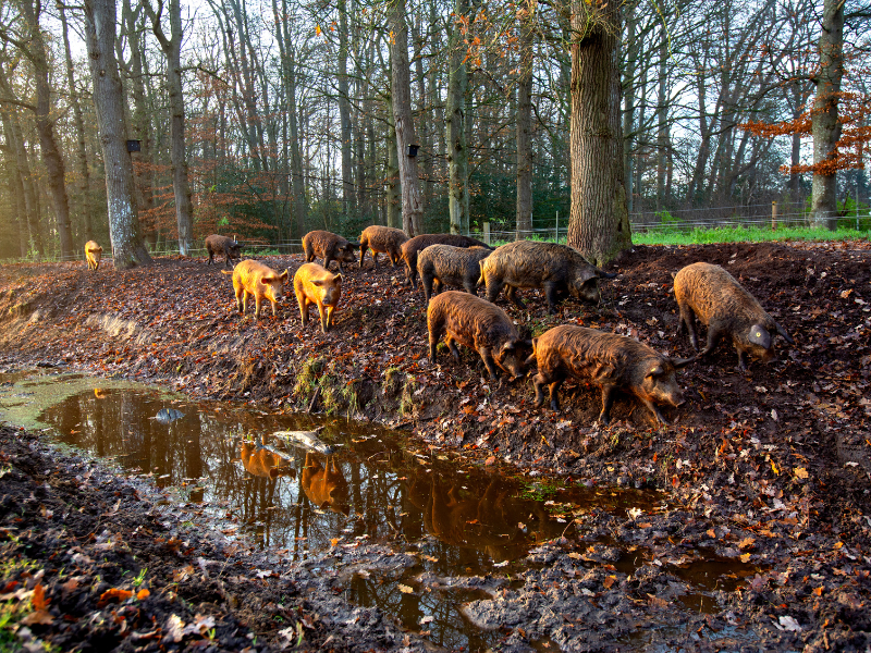 Onze varkens leven buiten in het bos, waar ze wroeten, scharrelen en een deel van hun voeding zelf vinden. Dat wroeten brengt lucht in de bodem, activeert bodemleven en helpt het bos zich te vernieuwen. Ze verwerken daarnaast reststromen zoals groenteresten en bijproducten van oliemolens, die zij omzetten in waardevol voedsel. De dieren worden minimaal een jaar oud en groeien in hun eigen tempo. Door beweging, voeding en leeftijd ontwikkelt het vlees zich anders: roder, steviger en voller van smaak, vaak dichter bij wildvlees dan bij gangbaar varkensvlees.