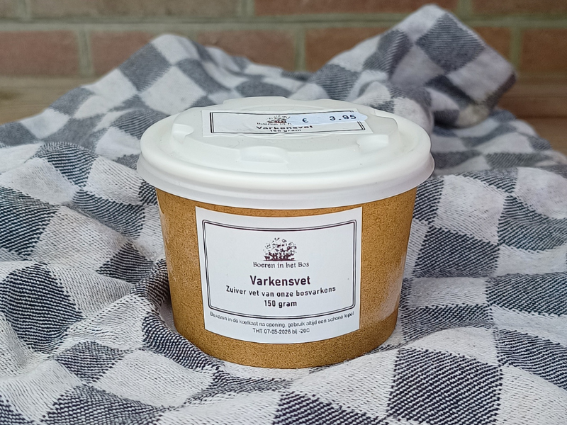 Varkensvet van onze oergezonde Tamworth bosvarkens. Echt ambachtelijk product, zonder toevoegingen en vol smaak! Je kunt erin bakken en braden, maar je kunt er ook wat van toevoegen aan andere gerechten of aan je bouillon. In het vet zitten veel vitamines (vooral B) en mineralen opgeslagen die de bosvarkens in de natuur hebben opgescharreld. Het vet is veelal onverzadigd, nog meer dan van het rund, wat het gezond maakt om te eten.